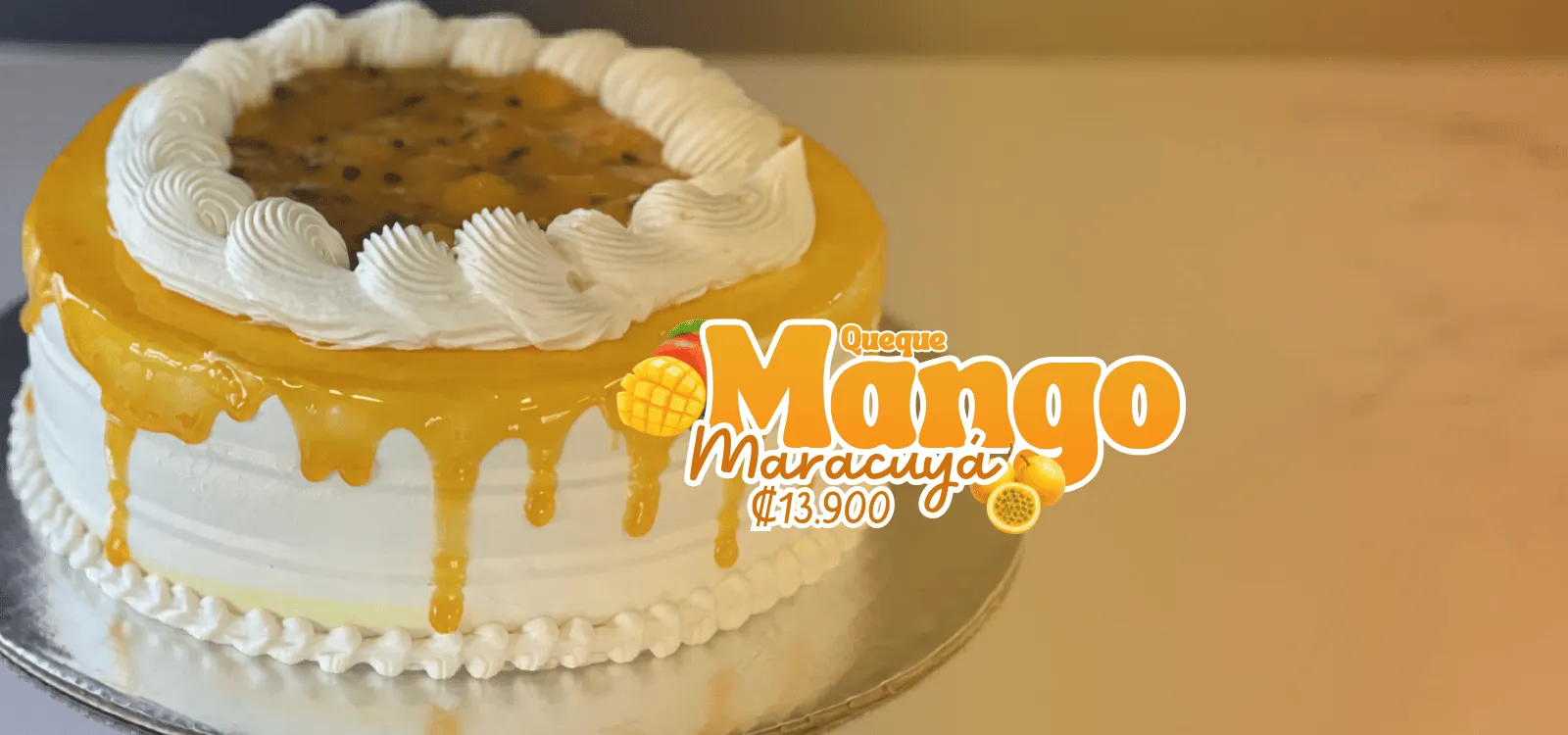 Queque de vainilla humedo el almibar, relleno con una compota de mango y maracuyá,